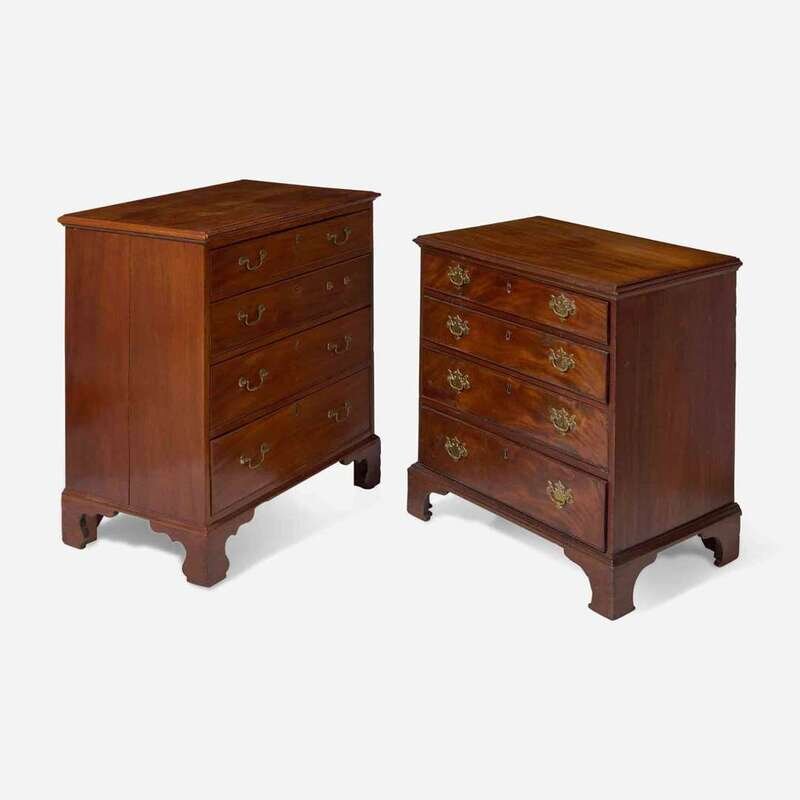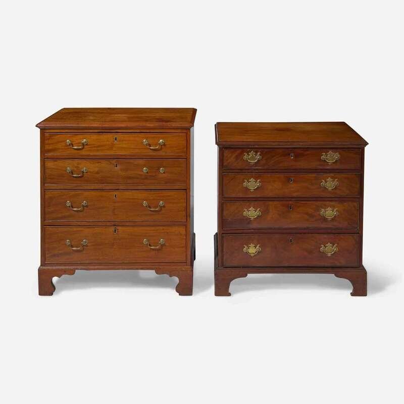 The first, with rectangular top, four graduated drawers, shaped bracket feet; the second, with rectangular thumb-molded edge top, above four graduated cockbeaded drawers, molded base on shaped bracket feet.
