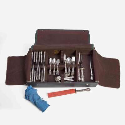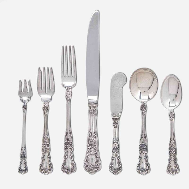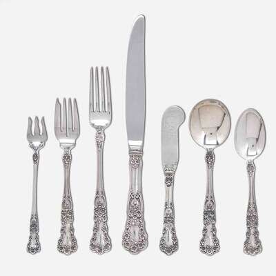 Comprising fourteen dinner forks, fourteen salad forks, fifteen seafood forks (four of a differing form, with gilt-washed bowls), twenty-seven tablespoons, fourteen soup spoons, fourteen dinner knives, twelve butter spread knives, two carving forks, two carving knives, a serving fork, a serving spoon, a small fish knife, two small ladles, two oyster forks, two nut / serving spoons, and two butter knives; most items marked; some pieces apparently assembled at a later date, with slightly varying sizes, forms, and hallmarks; the gilt-washed seafood forks engraved with monogram, "CV." (125 pieces total).