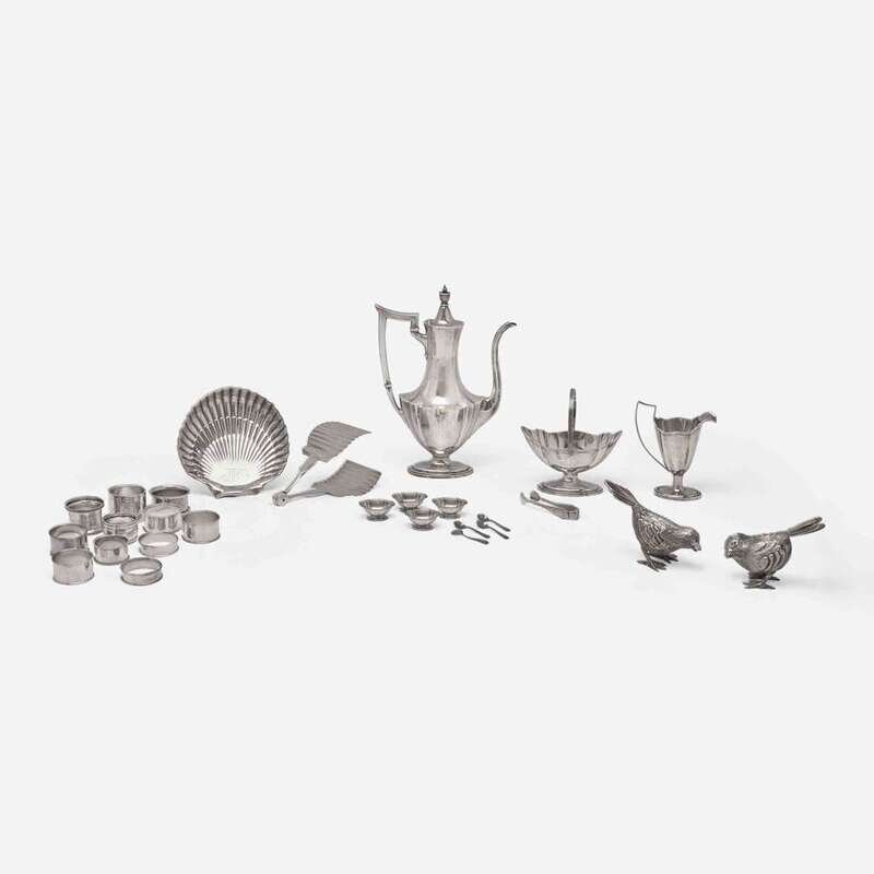 Comprising a three-piece sterling silver coffee service by Gorham Mfg. Co., Providence, RI, retailed by J.E. Caldwell & Co., early 20th century, comprising a coffeepot, a creamer, and a sugar basket, each engraved with monogram, "HFE," marked; a sugar tongs with cast floral motifs, mark rubbed, marked "Sterling"; a sterling silver shell-form dish by Gorham Mfg. Co., Providence, RI, retailed by J.E. Caldwell & Co., Philadelphia, PA, 20th century, engraved with monogram, "FHP," marked engraved with monogram, "HFE," marked; a set of four footed salt cellars and salt spoons, the salt cellars engraved with monogram, "E.S.C.," all marked, "Sterling"; a silver asparagus tongs by Christofle, Paris, France, 20th century, marked; and an assorted group of eleven sterling, coin, and silver-plated napkin rings: five sterling silver examples by Gorham Mfg. Co. (one engraved with monogram "B"), one sterling silver example by Towle, MA, engraved with monogram, "A," one marked "925," two examples with engraved names or monograms: "BM" (marked "Sterling") and "Lizzie"; one English sterling silver example marked by maker "A.E.W," Birmingham, 1943, engraved with monogram, "Bob", and a silverplated example engraved with monogram "T.C.T.C."; together with two silver-tone metal birds, unmarked. (27 items total).