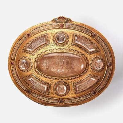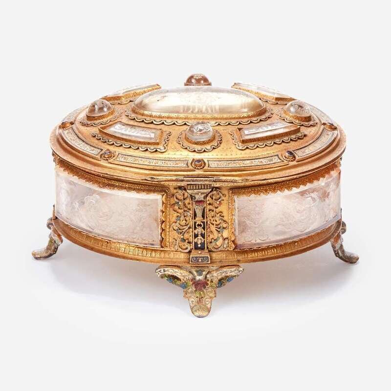 A Renaissance Revival etched glass, enamel, and gilt metal mounted casket Probably Austrian, late 19th / early 20th century