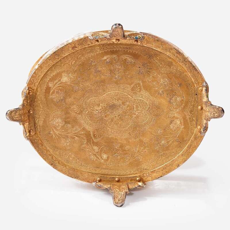 In the style of Karl Rössler, of oval form, the glass panels decorated with mythological figures and scrolls, the underside etched with fruit and floral motif, apparently unmarked.