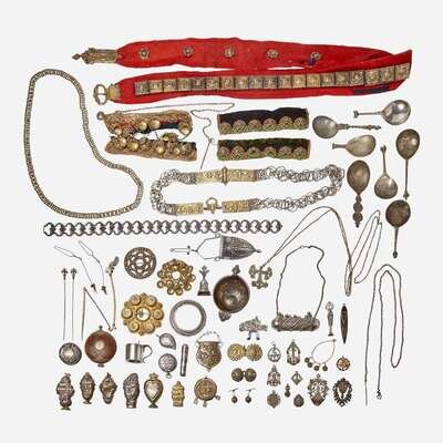 Comprising various silver, gilt metal, and silverplated objects including reliquary boxes (some inset with cut glass or crystal cabochons), a pilgrim flask with burlwood body, a two-handled cup, a holy water stoup, cloak pins and fobs, belts and belt loops / hooks (some with silver or gilt metal mounts on wool or silk backings), religious medals and necklaces, chatelaines, vinaigrettes, pomanders, and apostle spoons (many marked). (approx. 55 pieces).