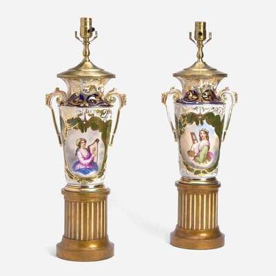 Mounted as lamps, the vases with gilt and polychromed enamel, each depicting a muse of the arts: a harpist and painter; apparently unmarked.