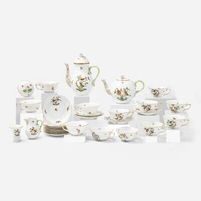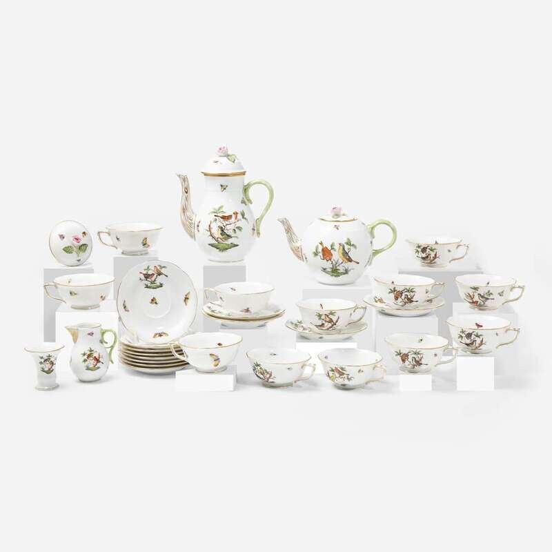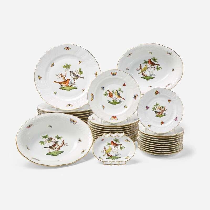 A Herend porcelain part dinner, tea, and coffee service in the "Rothschild Birds" pattern Modern, blue printed factory marks