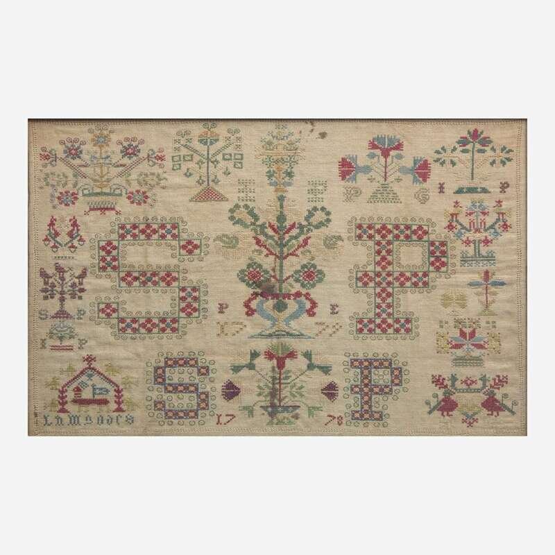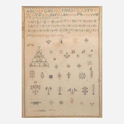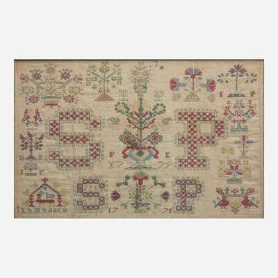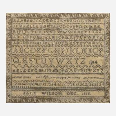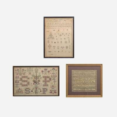 Comprising an Anglo-Indian sampler, possibly from Krishnagiri, probably early 19th century, with multicolored threads on a cotton or linen ground, depicting vine border surrounding various motifs such as a pyramidal bird cage filled with birds, small dogs, tree, flowers, heart, geometric patterns, and hookah, the top with English alphabet above Sanskrit alphabet, inscribed at lower left, "Krishnagyr Girlrs," framed; a needlework sampler, possibly Scandinavian, dated "1778" and "1779," with multicolored threads on cotton or linen ground, depicting two central flower urns each flanked by oversized monogram "SP" and dates "1778" and "1779" respectively, the upper urn also flanked by small monogram, "PE," the border depicting various motifs including flowers, flower baskets, trees, heart, and birds, the lower left corner inscribed, "Lamzoars" (?), framed; and an alphabet sampler with dark threads on cotton or linen ground, inscribed and dated, "1814" and "Jane Wilson Dec. 1815," with Greek key border, matted and framed.