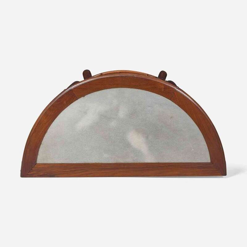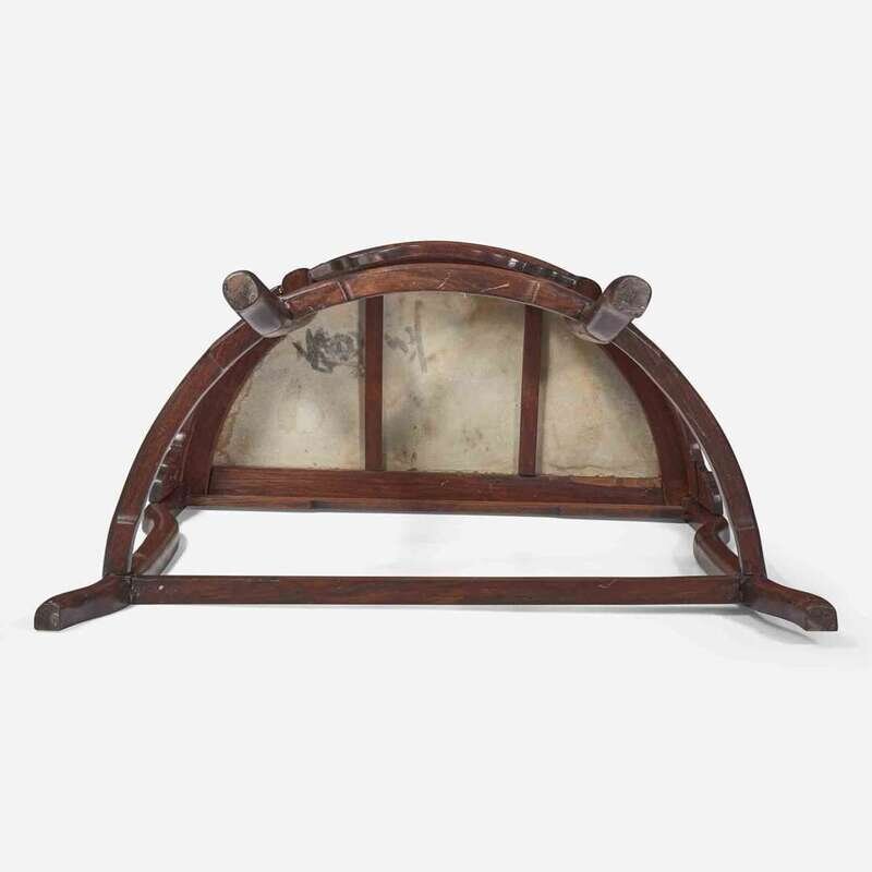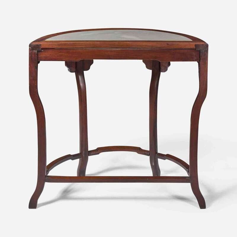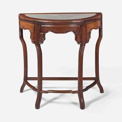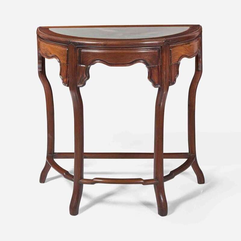 The top inset with a slab of grey-white stone with lighter zones, above an arched skirt, the curved legs joined by shaped humpback stretchers