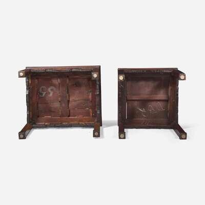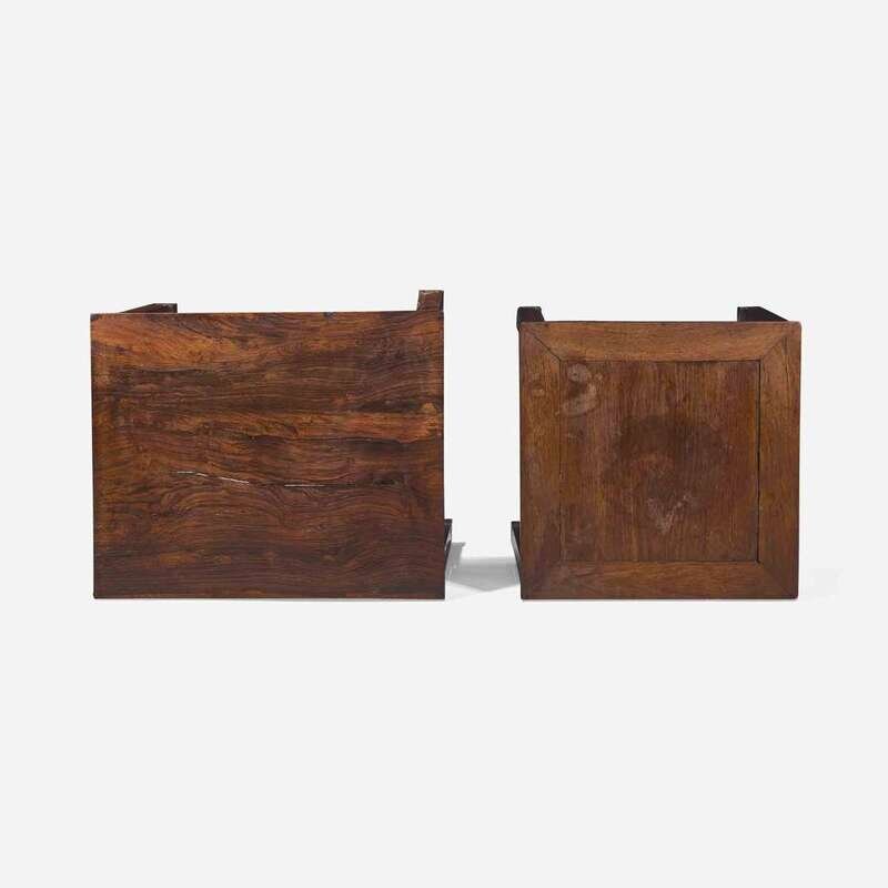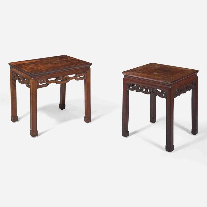 The first, rectangular, the top veneered, possibly with huanghuali, all over a scrolled skirt, square legs and scrolled feet; the second, square, with floating panel top, over scrolled skirt, square legs with scrolled feet.