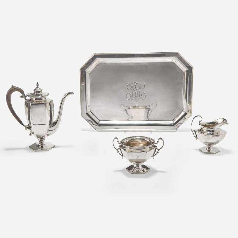 Comprising a tray, a coffeepot, a creamer, and a sugar dish, all engraved with the monogram, "BK," marked with maker's and retailer's marks, and "Pat. Sept. 26 '93" and "Pat. Dec. 25 '94."