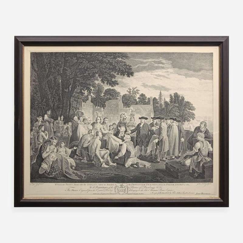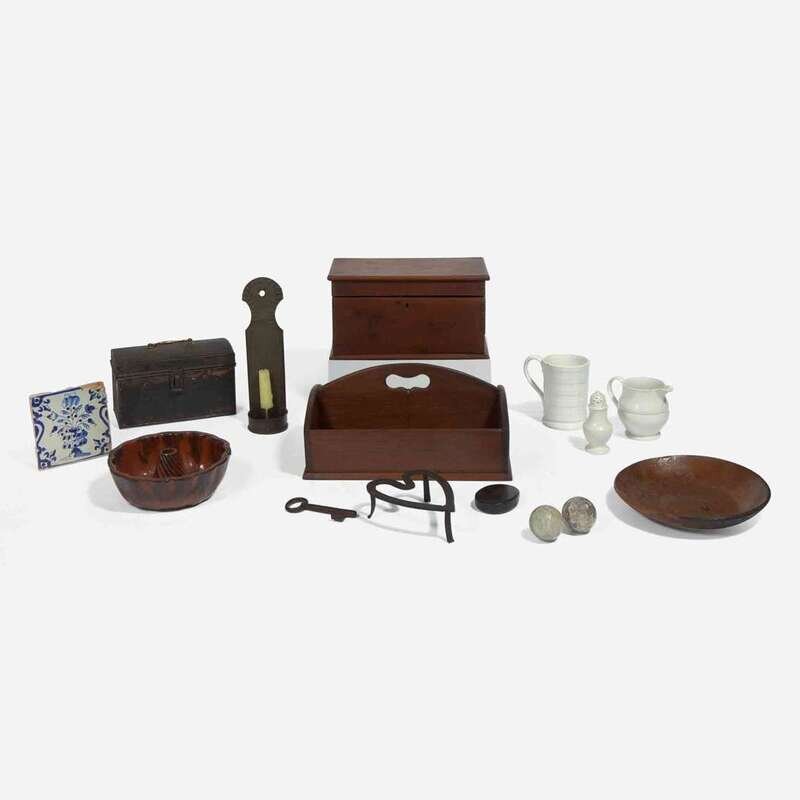 Comprising a carved mahogany box, a carved walnut cutlery box; a painted tinware document box; a tinware wall sconce; a painted tinware snuff box with anchor motif and inscription, somewhat illegible; a wrought iron heart-form trivet; a large iron key; a redware plate and food mold; a Delft blue and white tile; a pearlware mug, creamer, and pepper pot; and two large glass marbles; together with a Bicentennial restrike engraving of Penn's Treaty with the Indians, When He Founded the Province of Pennsylvania after Benjamin West (1738-1820), circa 1976, originally published by John Boydell, London in 1775, originally engraved by John Hall (1739-1797), framed.