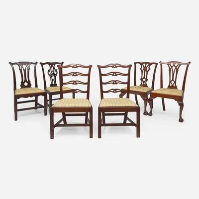 Comprising two side chairs with gothic splats and cabriole legs on ball-and-claw feet; a pair of ribbon-back side chairs, on straight legs with stretchers; and two side chairs with shaped crests and pierced splats, on straight legs with stretchers.
