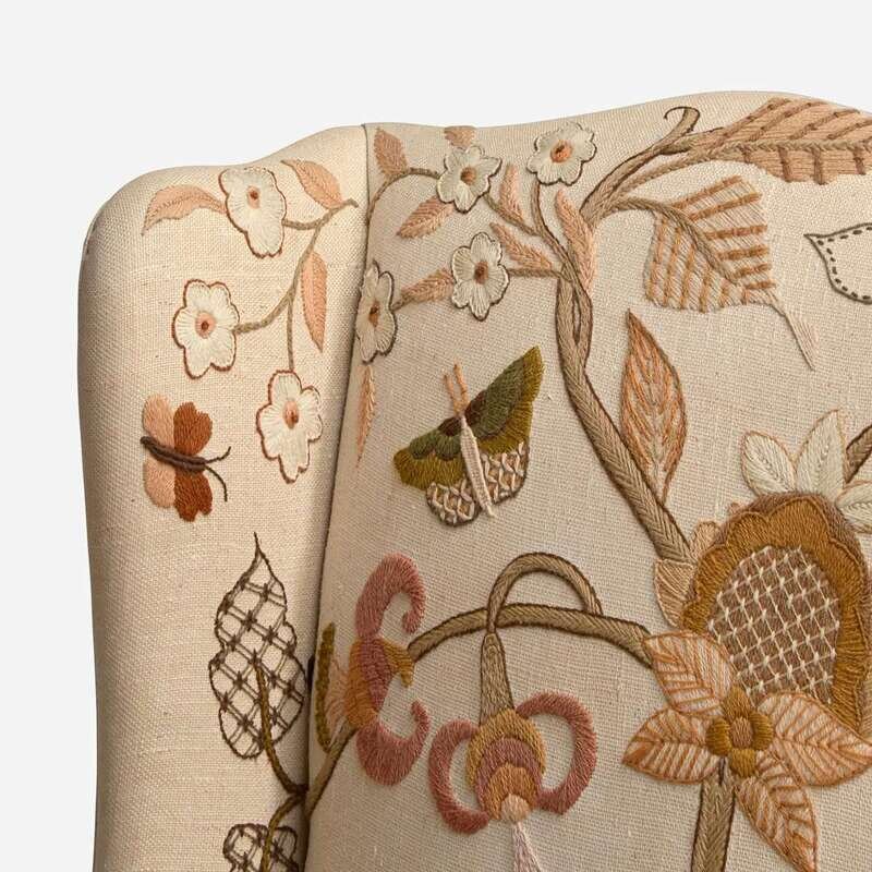 Carved and stained wood, upholstered by Erica Wilson with embroidery on a beige fabric ground