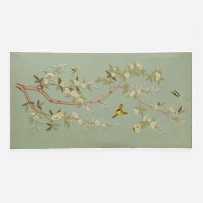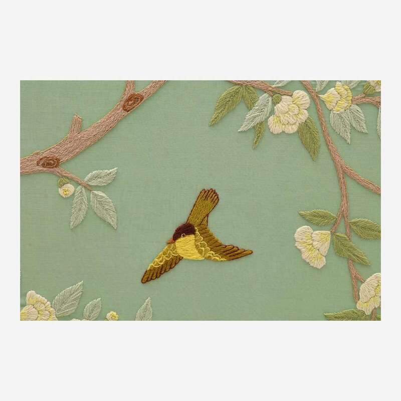 Embroidery on a blue-green fabric ground with white cotton twill backing, on wood frame