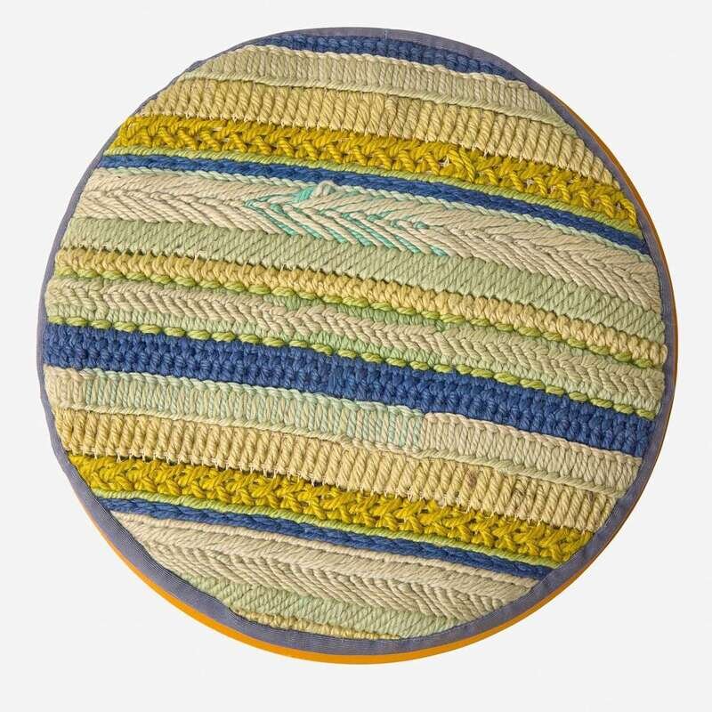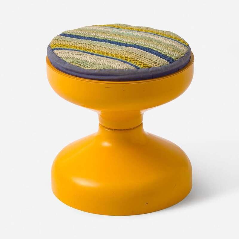 Erica Wilson (American, 1928-2011), Achille Castiglioni (Italian 1918-2002), and Pier Giacomo Castiglioni (Italian, 1913-1968) "Rocchetto" Kartell Stool with Erica Wilson Embroidered Cushion, Italy and USA, circa 1970