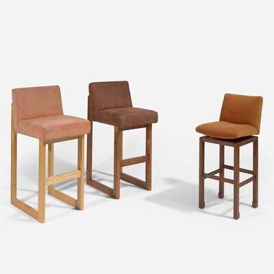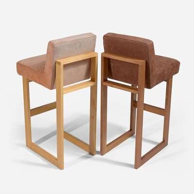 The Cubist bar chairs in stained walnut, clear-coated maple, suede upholstery