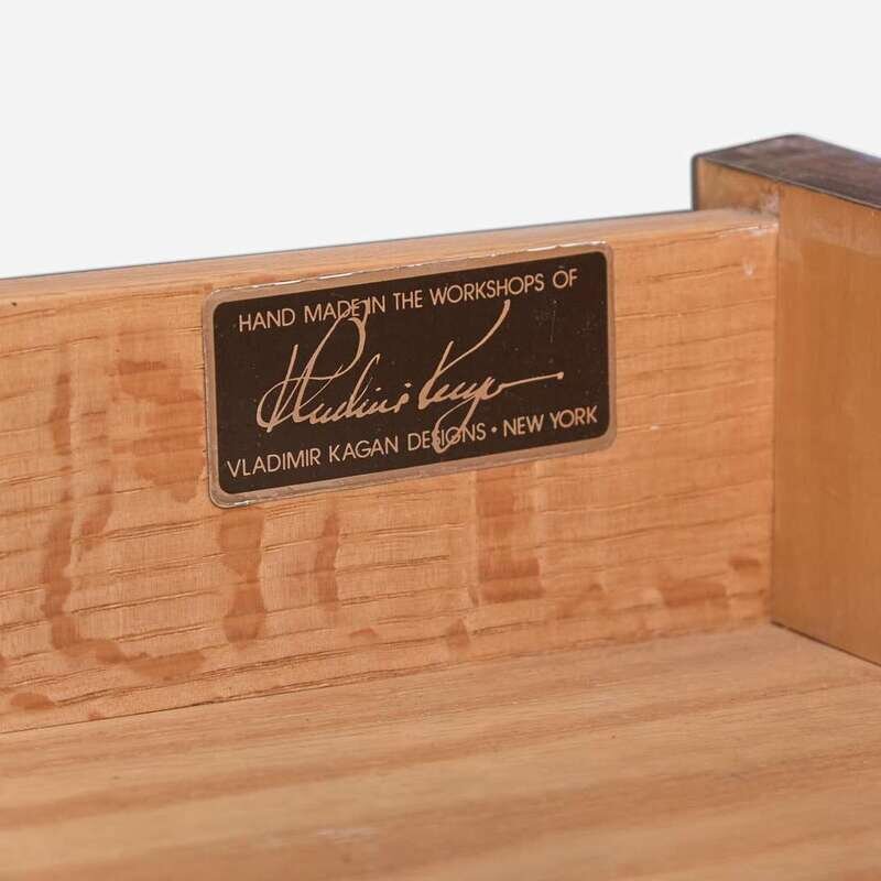 Label to interior of credenza drawer: "Hand Made in the Workshops of Vladimir Kagan, Vladimir Kagan Designs, New York"