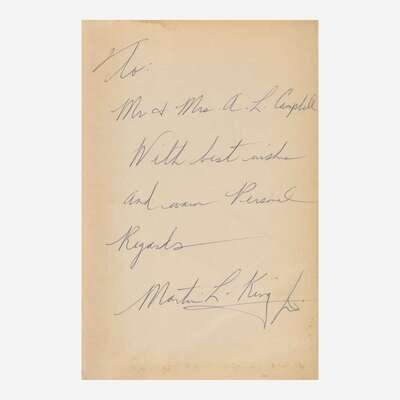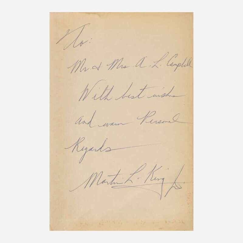 An important association copy of Martin Luther King, Jr.'s, first book, inscribed by him to Alfonso L. Campbell and his wife, Lucy B. Campbell, prominent members of the Montgomery, Alabama African American community and among the early organizers of the Montgomery Bus Boycott of 1955-56.