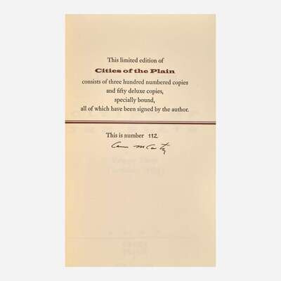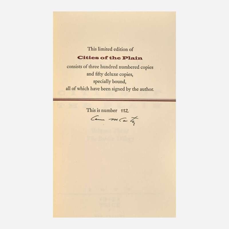 New Orleans: B.E. Trice, 1998. Limited edition, #112/300 numbered copies (from a total of 350) signed by McCarthy. 8vo. (iv), 291, (3) pp. Original brown leather over marbled paper-covered boards, stamped in silver; all edges trimmed; in original red cloth slip case.