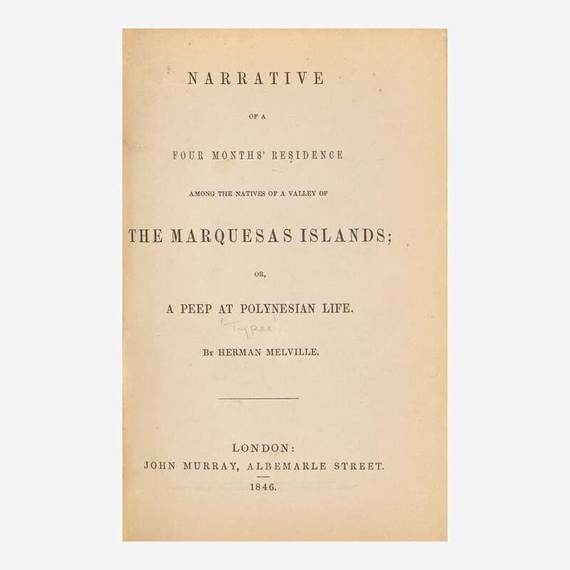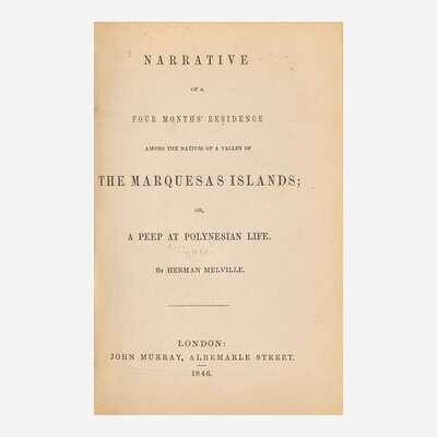 A handsome first edition of Melville's first book, more commonly known as "Typee." Published a month before the American edition.