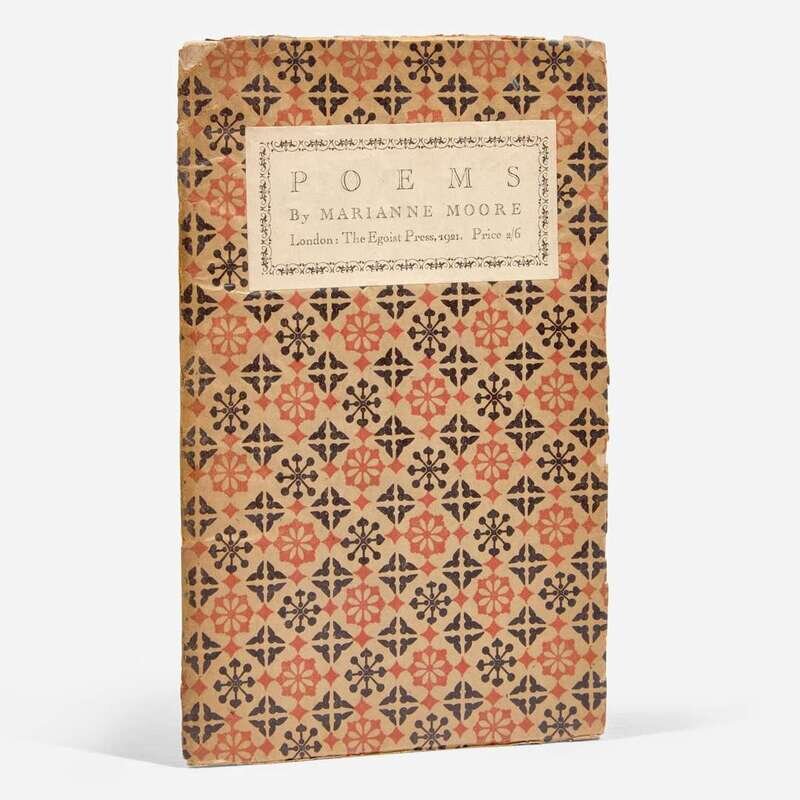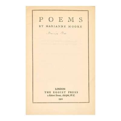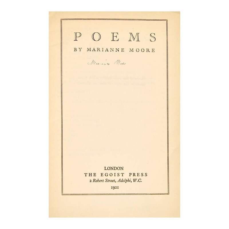 A rare signed first edition of Moore's fragile first published book of poetry. This work was infamously published without Moore's permission by her friends, the poet H.D. (Hilda Doolittle), and the novelist, Bryher (Winifred Ellerman). Moore had previously published poetry and reviews in the modernist literary journals The Dial, Egoist, and Contact, but by 1920 she was hesitant to further publish any poems. Upon learning of the publication of this collection, Moore was furious, and disapproved of the selection and title, although she approved of the printing, including the typography, binding, and paper.