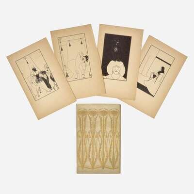 Rare, one of likely only 10 sets of Beardsley's illustrations. Includes illustrations for The Murders in the Rue Morgue, The Black Cat, The Masque of the Red Death, and The Fall of the House of Usher. "In late December 1893 the Chicago publisher Stone and Kimball commissioned Beardsley to provide illustrations for the 'Tales' section of the large paper version of Poe's collected works. The four designs he completed appeared not in the volumes themselves, but in a separate, undated, portfolio, about which there is uncertainty regarding the number of copies produced. In his authoritative history of the firm, Sidney Kramer makes no mention of the Beardsley portfolio, but does describe an entirely different (but identically bound) portfolio containing 18 engravings by mid-19th-century French artists. Kramer connects this to the Japan paper 'edition' apparently reserved for the Poe set's collaborators and never offered for sale. Gallatin at first believed that the Beardsley portfolio formed part of the large paper issue (250 copies on handmade paper) but later, in the Princeton catalogue he compiled with Alexander Wainwright, concluded that it 'accompanied the Japan paper issue which consisted of only ten sets.' As evidence that Gallatin was correct, Warrack and Perkins cite the portfolio's scarcity; they located just six copies..." (Mark Samuels Lasner, A Selective Checklist of the Published Work of Aubrey Beardsley, pp. 50-51).