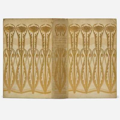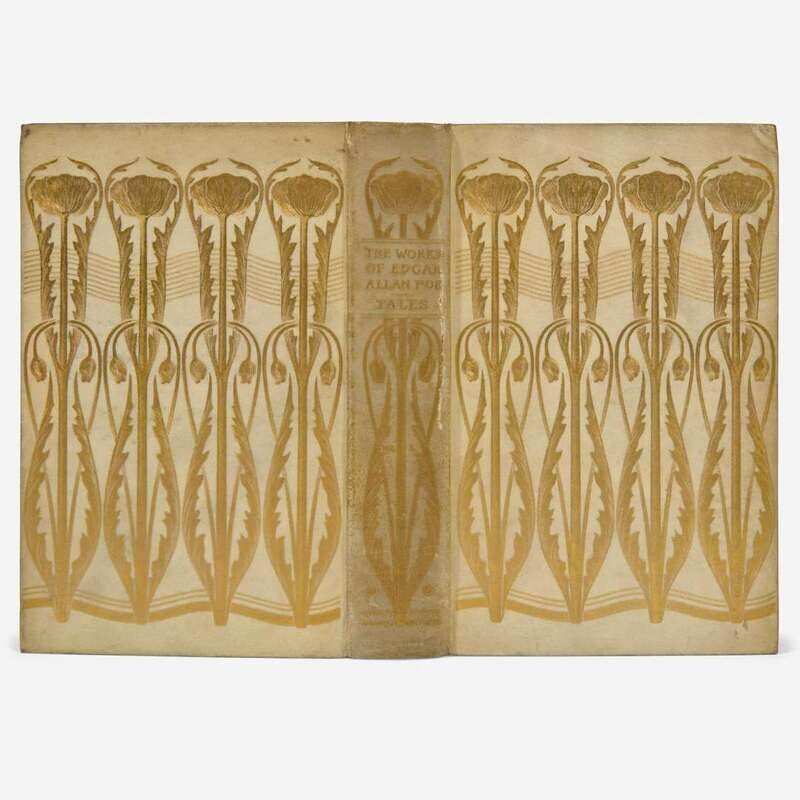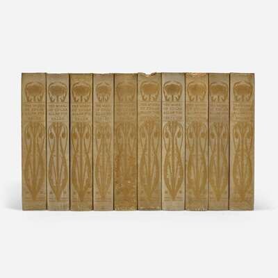 Chicago: Stone & Kimball, 1894-95. In 10 volumes. Large paper edition, #150/250 numbered copies. Edited by Edmund Clarence Stedman and George Edward Woodberry. Illustrated with a frontispiece portrait of Poe, and others, in each volume, and plates by Albert Edward Sterner. Original full vellum, ornately stamped in an Arts and Crafts-style floral design on boards and spine, boards and spine darkened and with scattered foxing, scratch along spine of Volume I, head of spine on Volumes IV, VI, and VIII chipped, others variously worn, feet of spine variously worn; all edges untrimmed; foxing to endpapers and prelims in all volumes, scattered light foxing and minor soiling to text in same; with the Arts and Crafts-style book-plate of United States judge Harold R. Medina on front paste-down of each volume.