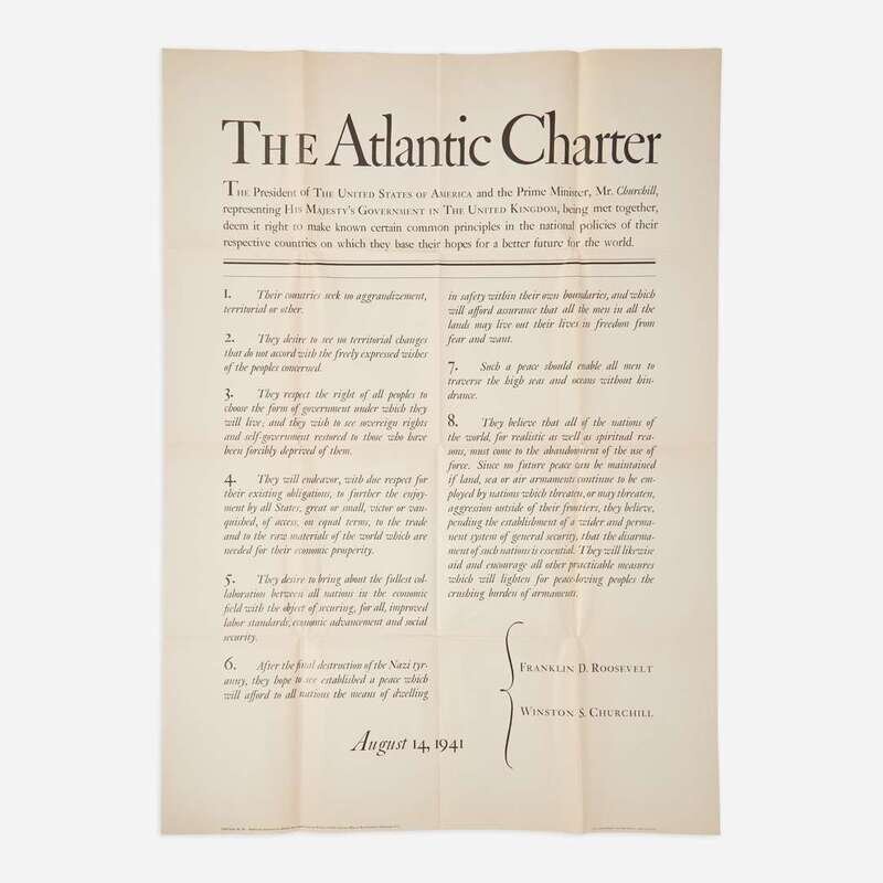 The Atlantic Charter was the joint statement issued by the American and British governments on August 14, 1941, outlining their goals for the world after the end of World War II. The conference that drafted the Charter was held in Placentia Bay, Newfoundland on August 9 and 10, 1941 aboard the USS Augusta, and was called in response to the quickly changing geopolitical situation in Europe. By mid-1941 the British had just suffered humiliating defeats in the Balkans to the Nazis, who were simultaneously sweeping across North Africa threatening to close the Suez Canal, and in June had begun their invasion of the Soviet Union. While the United States was materially supporting Great Britain with the Land Lease Act, the threat of invasion loomed large as Europe fell. The nonbinding treaty drafted in August outlined eight common principles for the postwar world, including an agreement that both countries would halt territorial expansion, enact the liberalization of international trade, the establishment of freedom of the seas, as well as setting international labor, economic, and welfare standards. Finally, both countries agreed to support the restoration of self-governments for all countries that suffered occupation, and to allow their people to determine their own form of government. Both Roosevelt and Churchill hoped the Charter would galvanize American support for their intervention in the war--and this poster was likely created to be posted publicly in an effort to raise American support--but the American public stood firmly on the side of nonintervention. It wouldn't be until that December, with Japan's attack on Pearl Harbor, that American public sentiment changed, and the United States entered the conflict.