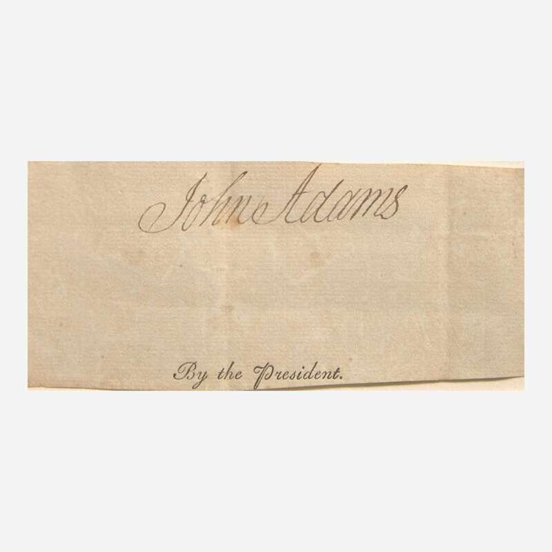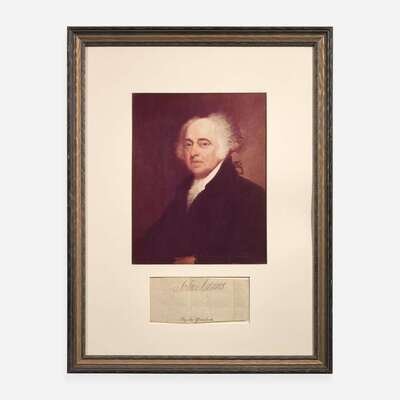 No place, no date, ca. 1797-1801. Cut signature of John Adams as President of the United States; 2 1/2 x 5 1/2 in. (38 x 140 mm). In mat with a portrait of Adams, and in frame, 19 1/4 x 14 3/4 in. (489 x 375 mm).