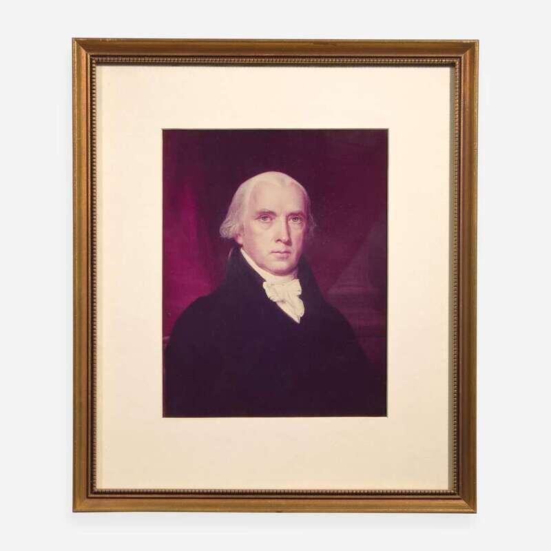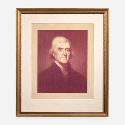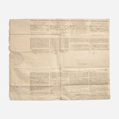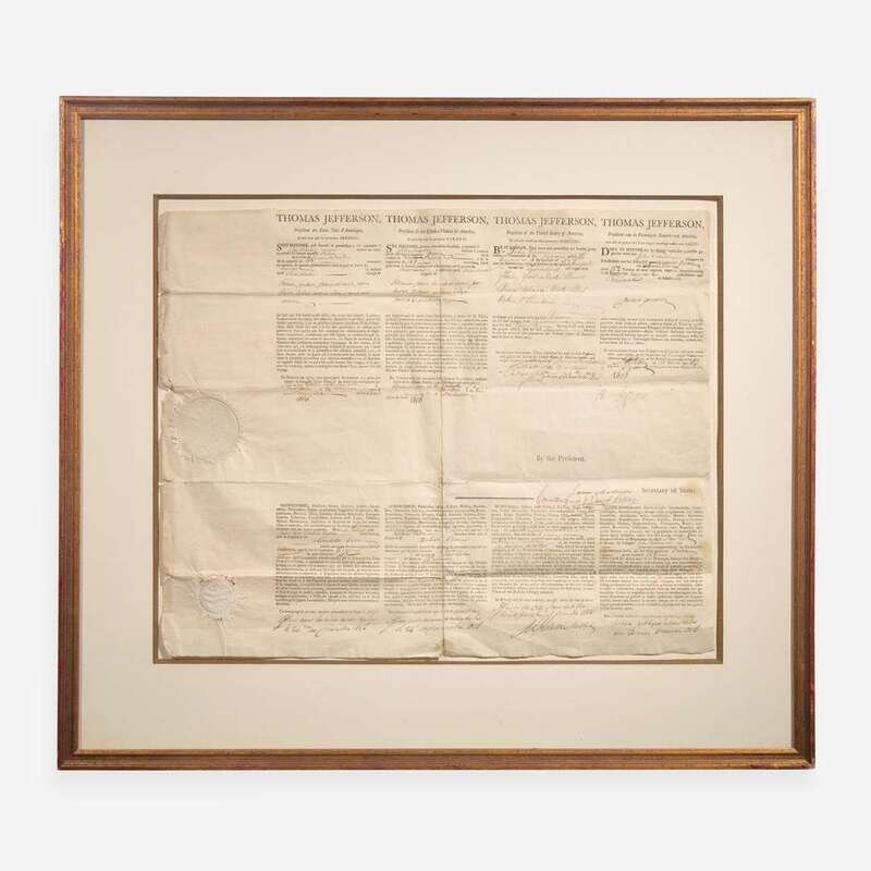 (Washington, D.C.), December 24, 1806. Partially-printed four-language ship's passport, signed by Thomas Jefferson as President of the United States, for John Travers, master of the Schooner The Ocean; counter-signed by James Madison as Secretary of State, and David Gelston as Collector of the Port of New York; 16 1/2 x 20 1/4 in. (419 x 514 mm); original paper seals intact. Creasing from contemporary folds, small separations at intersecting center folds, as well as at fold edges; minor spotting in bottom right corner. In mat and in frame, 24 5/8 x 27 5/8 in. (625 x 711 mm). Together with framed portraits of Jefferson and Madison.