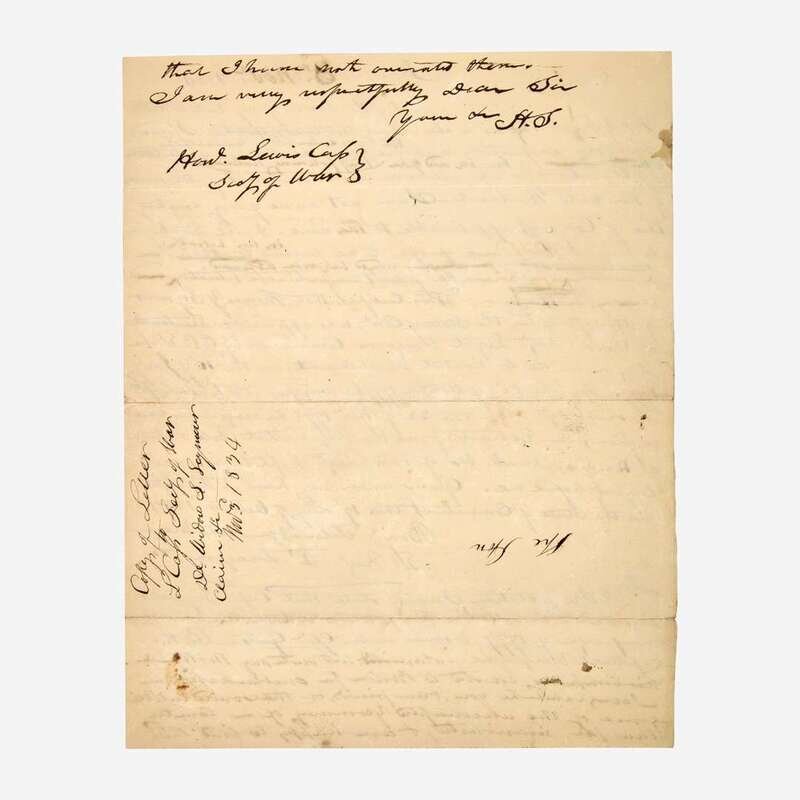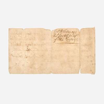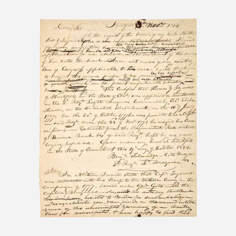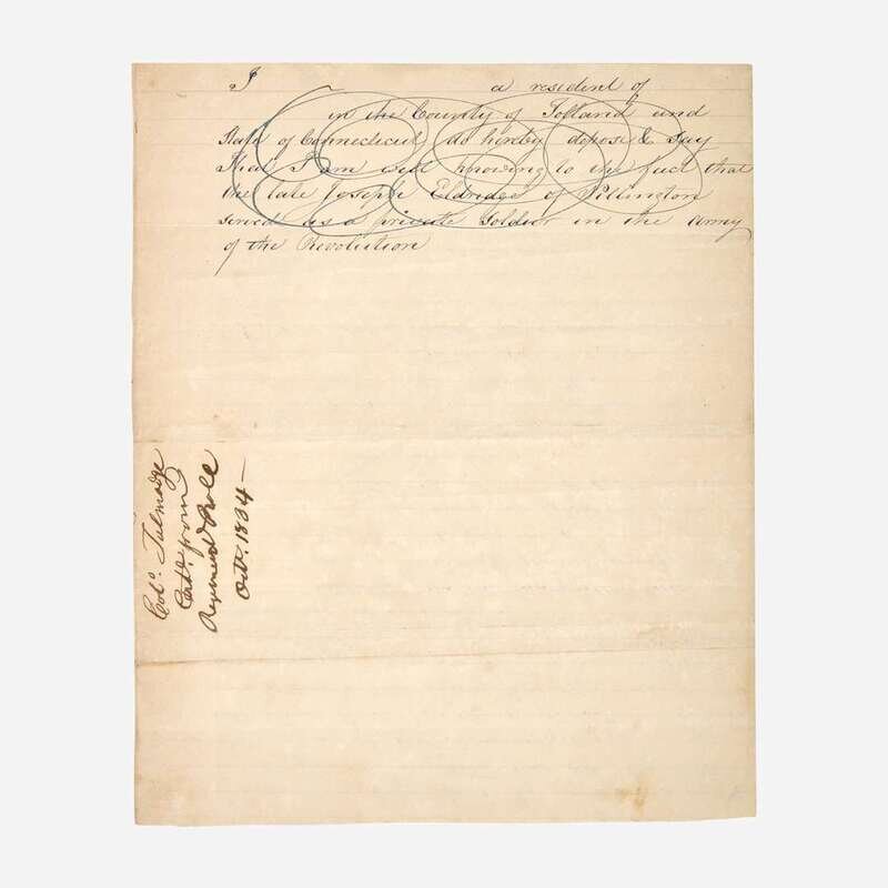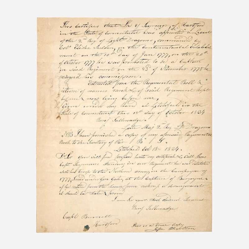 Hartford (Connecticut), February 24, 1792. One oblong sheet, 3 3/4 x 7 3/8 in. (95 x 186 mm). Autograph document, signed by Benjamin Tallmadge, "Receiv'd Hartford Feby 24th 1792 from A. Hubbard Esqr. of Middletown of the hands of Dan. Jones Eight Dollars for Elijah Hubbard, Abijah Savage, Nehemh. Hubbard & George (illegible) Taxes on their shares in the Ohio Purchase-- Benj. Tallmadge - Agent." Docketed on the verso "Col. B. Talmages (sic) Rect. for 48/ for Exps. of Ohio Lands (?)" Creasing from contemporary folds, tears along the same, unevenly toned. Lot includes two additional documents related to Tallmadge: a manuscript letter, initialed by Henry Seymour of Hartford to Secretary of War Lewis Cass, attesting to the Revolutionary War service of his late brother, Thomas Y. Seymour, who served with Tallmadge, and a true copy of a letter written by Tallmadge, confirming that the late Seymour had indeed served with him.