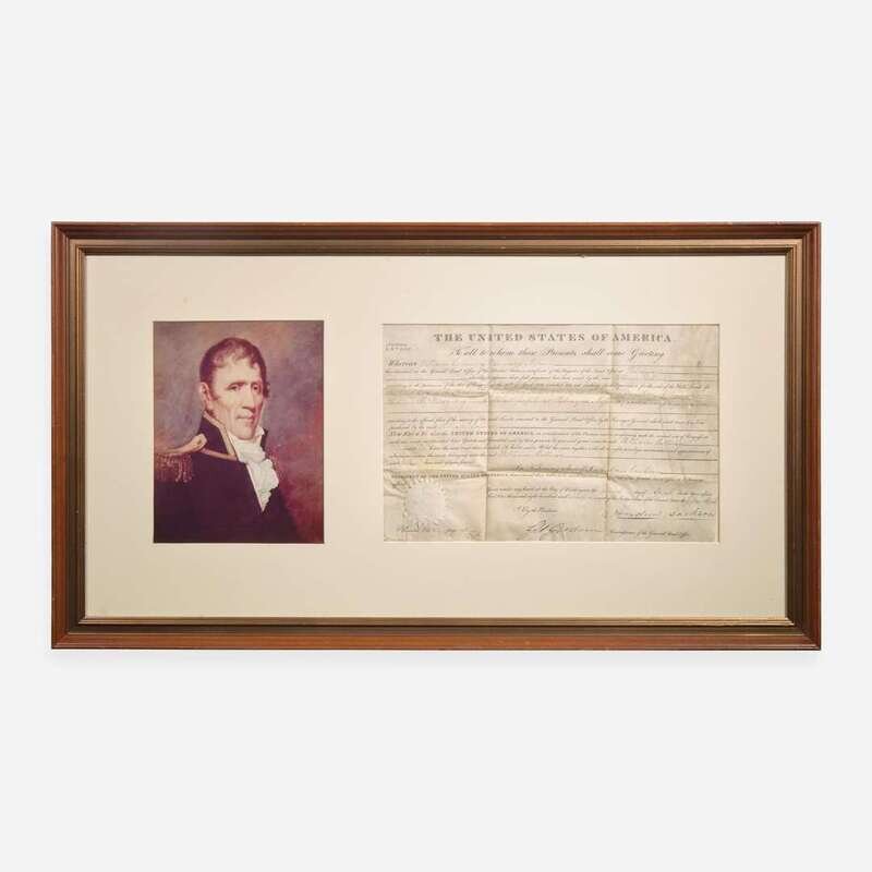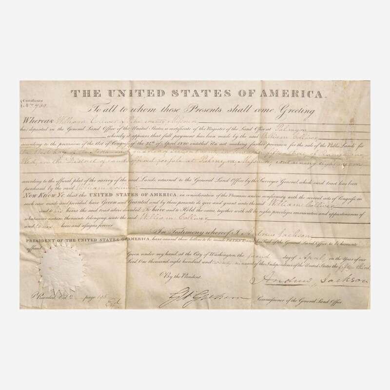 (Washington, D.C.), April 2, 1829. Partially-printed land patent on vellum (Certificate No. 400), signed by Andrew Jackson as President of the United States, for William Colliver of Pike County, Missouri, for 80 acres of land in Palmyra, Missouri; counter-signed by George Graham, Commissioner of the General Land Office; paper seal intact, bottom left corner. Creasing from contemporary folds; abrasion and small hole in top right, affecting a few manuscript letters; scattered light spotting. In mat with a portrait of Jackson, and in frame, 18 3/8 x 33 1/8 (467 x 841 mm).