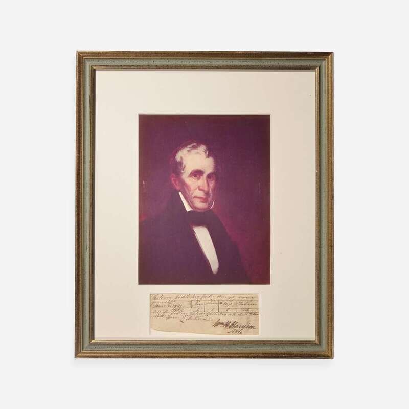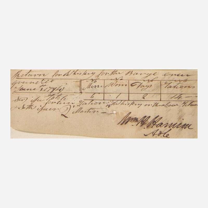 Greenville, (Ohio), June, 4, 1794. One oblong sheet, 2 1/4 x 6 1/2 in. (57 x 165 mm). Manuscript document in a secretarial hand, signed by William Henry Harrison ("Wm. H. Harrison/A.d.C."), as aide-de-camp during the Northwest Indian War, requisitioning rations of whiskey for a barge crew; with manuscript table listing 14 rations for six men and one woman on the crew for two days use; inscribed on verso "No. 65/Wm. H. Harrison/7 Gills Whiskey/4 June 1794", further inscribed on same, "Recd. Seven Gills Whiskey...". Small cancellation hole at center. In mat with a portrait of Harrison, and in frame, 17 1/2 x 14 3/4 in. (444 x 375 mm).