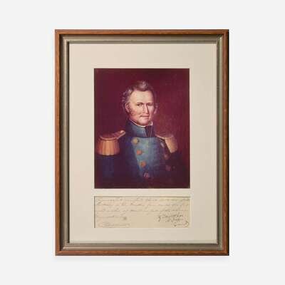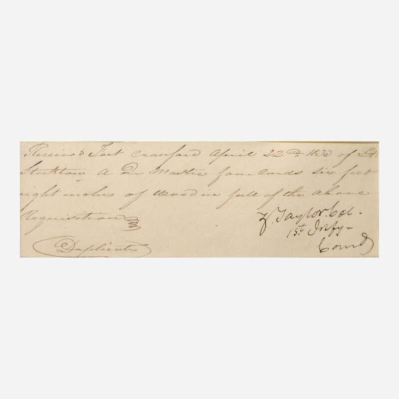 Fort Crawford (Michigan Territory), April 22, 1833. One oblong sheet, 2 1/2 x 7 1/2 in. (64 x 191 mm). Duplicate document signed by Zachary Taylor as Colonel Commanding the 1st United States Infantry, being a receipt for "six feet eight inches of wood in full of the above Requisition". In mat with portrait of Taylor, and in frame, 18 x 13 3/4 in. (457 x 349 mm).