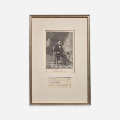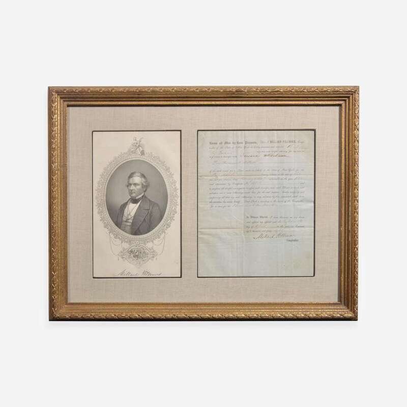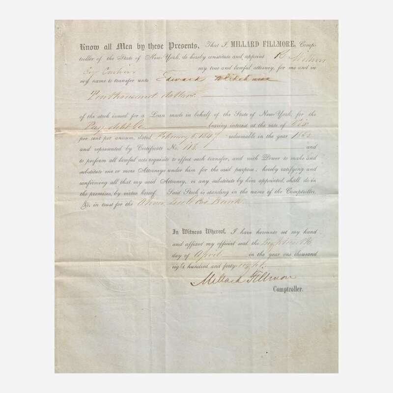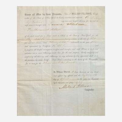 (New York), April 18, 1848. One sheet folded to make four pages, 7 1/2 x 9 1/2 in. (190 x 241 mm). Partly-printed document, signed by Millard Fillmore as Comptroller of the State of New York appointing "R. Withers Esq Cashier my true and lawful attorney, for me and in my name to transfer unto Edward Whitehouse Ten thousand dollars of the stock issued for a Loan made in behalf of the State of New York...redeemable in the year 1852"; docketed on verso: "Comptroller to Edward Whitehouse Certificate No. 118. Bonds of 1852." Creasing from old folds; lightly toned. In mat with portrait of Fillmore, and in frame, 15 1/8 x 20 in. (384 x 508 mm).