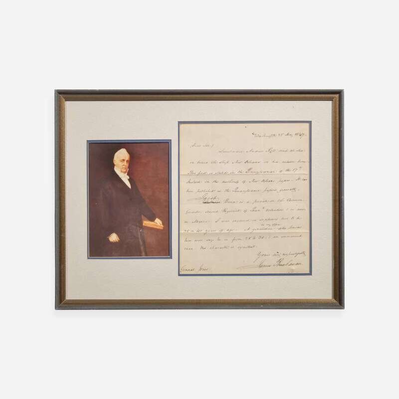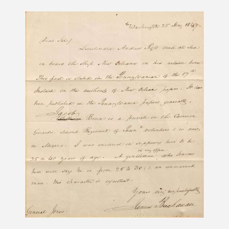 Washington, (D.C.), May 25, 1847. One sheet, 8 x 10 in. (203 x 254 mm). Autograph letter, signed by James Buchanan as Secretary of State to "General Jones", likely Adjutant General of the U.S. Army, Roger Jones (1789-1852): "Dear Sir//Lieutenant Andrew Ross died at sea/on board the Ship New Orleans on his return home./This fact is stated in the Pennslyvanian of the 17th/Instant on the authority of New Orleans papers. It has/been published in the Pennsylvania papers generally./Jacob Brua is a private in the Cameron/Guards, second Regiment of Penna volunteers & is now/in Mexico. I was incorrect in supposing him to be/35 or 40 years of age. A gentleman in my office who knows/him well says he is from 28 to 30; & an unmarried/man. His character is excellent./Yours very respectfully,/James Buchanan/General Jones". Creasing from old folds; ink smear; small tear to the lower right. In mat with a portrait of Buchanan, and in frame 12 3/4 x 16 3/4 in. (324 x 425 mm).