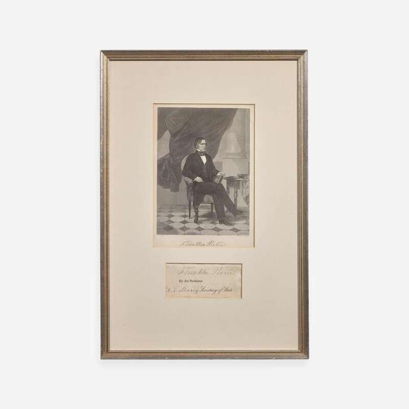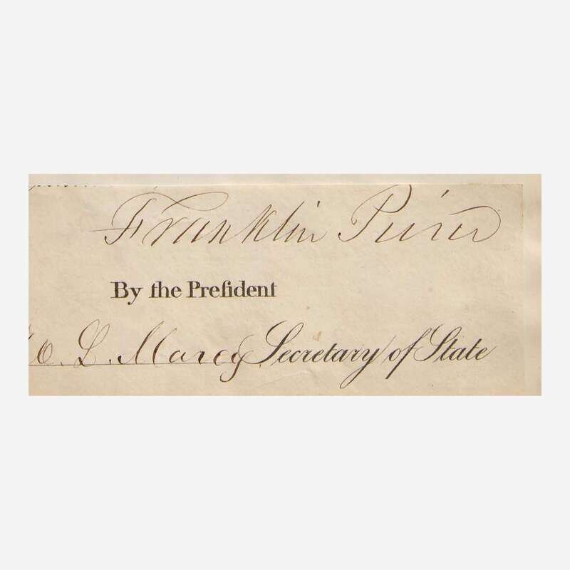 (Washington, D.C., no date). One oblong sheet, 2 x 4 1/4 in. (51 x 108 mm). Fragment of a partially-printed document, signed by Franklin Pierce as President of the United States; counter-signed by Secretary of State Randolph Marcy. Tipped to a larger sheet. In mat with a portrait of Pierce, and in frame, 18 1/4 x 12 1/4 (463 x 311 mm).