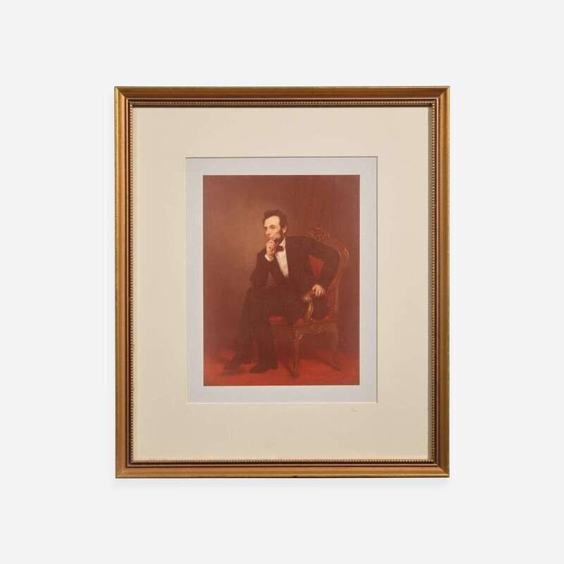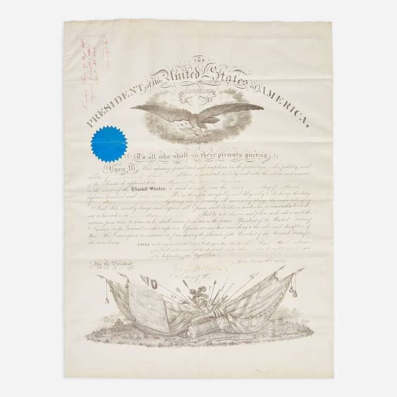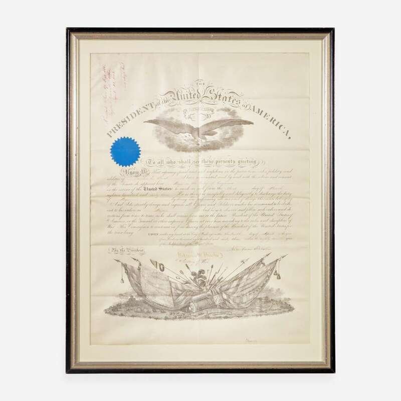 Washington, (D.C.), April 13, 1863. Partially-printed military commission on vellum, signed by Abraham Lincoln as President of the United States, appointing Charles E(dward). Blunt a Major in the Corps of Engineers; counter-signed by Edwin Stanton as Secretary of War; MS. in top left corner recording this document in Adjutant General's Office's official records, signed by Assistant Adjutant General, E.D. Townsend; blue paper seal intact; docketed by Blunt on verso. Creasing from contemporary folds, light soiling in top left edge. 19 3/8 x 14 3/4 in. (492 x 375 mm). In mat and in frame, 22 5/8 x 17 1/2 in. (575 x 444 mm). Lot includes a framed portrait of Lincoln.