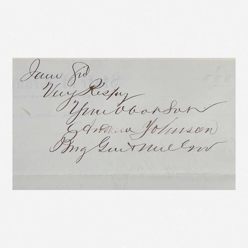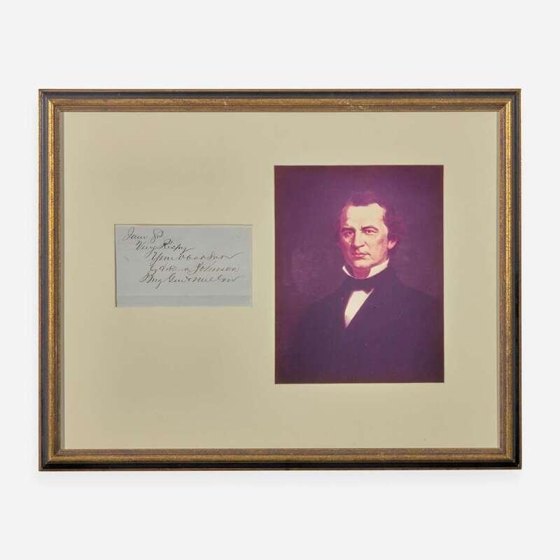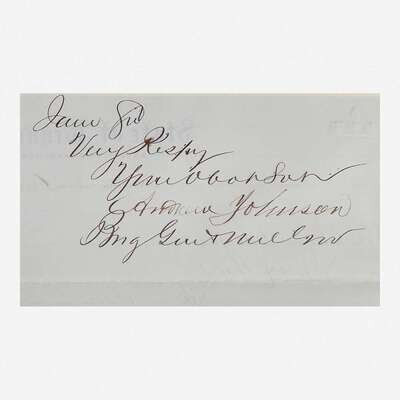 Nashville, Tennessee, August 31, 1864. One sheet, approximately 9 3/4 x 7 1/2 in. (248 x 190 mm). Manuscript letter in a secretarial hand, on State of Tennessee, Executive Department stationery, signed by Andrew Johnson, as Military Governor of Tennessee, to Secretary of War Edwin Stanton. Johnson requests that 1st Lieutenant Edward S. Richards be appointed Captain and Assistant Adjutant General for the state of Tennessee. Creasing from contemporary folds. In mat with a portrait of Johnson, and in frame, 17 x 21 1/2 in. (432 x 546 mm).