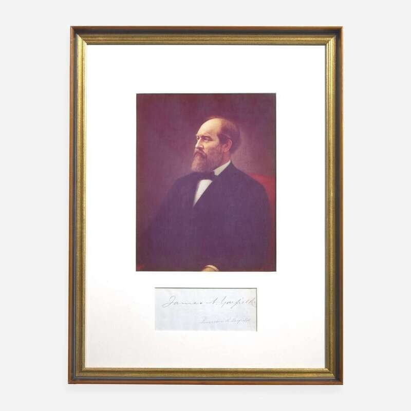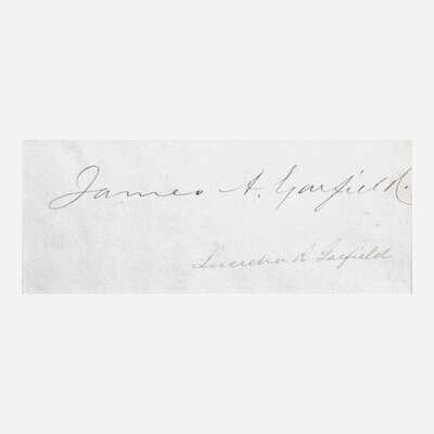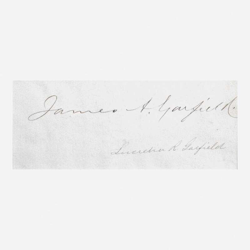 No place, no date. Cut signature ("James A. Garfield"); additionally signed by First Lady Lucretia R. Garfield; 3 1/2 x 6 1/2 in (89 x 165 mm). In mat with portrait of Garfield, and in frame, 19 x 14 1/2 in. (483 x 368 mm).