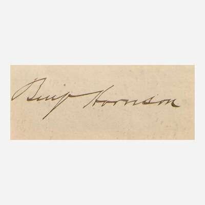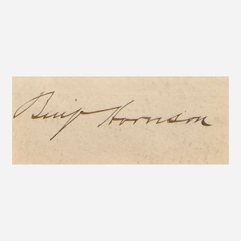 No place, no date. Cut signature ("Benj. Harrison"); 1 1/2 x 3 3/4 in. (38 x 95 mm). In mat with a portrait of Harrison, and in frame, 15 1/2 x 10 1/2 in. (394 x 267 mm).