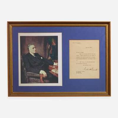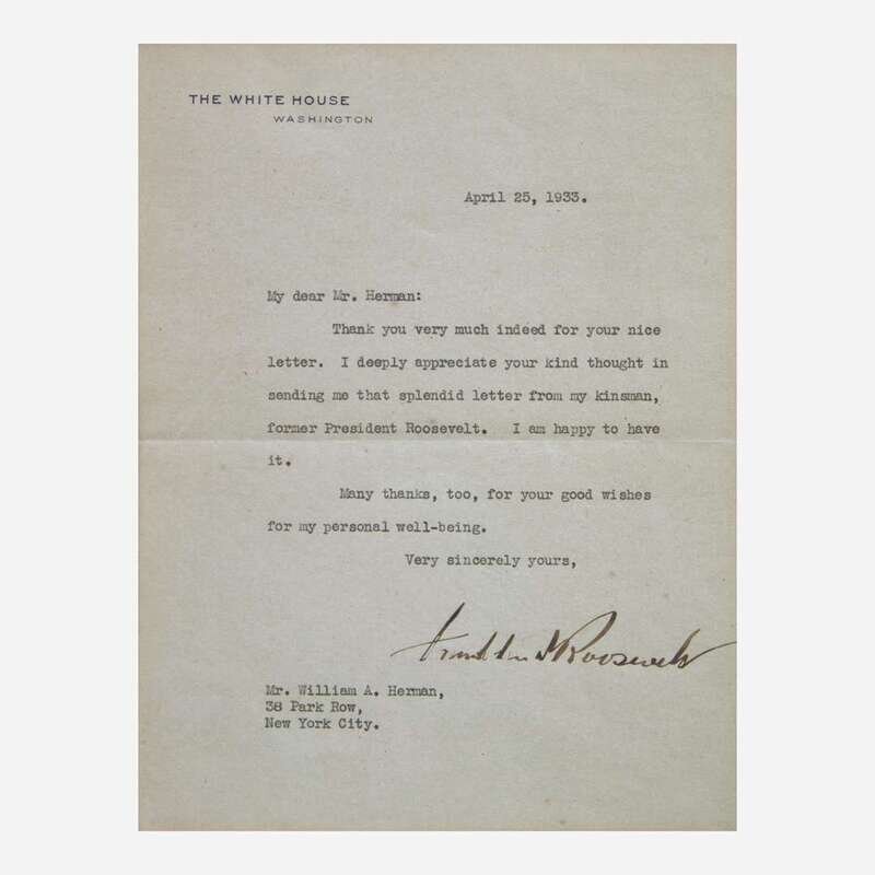 Washington (D.C.), April 25, 1933. One sheet, 8 x 6 1/2 in. (203 x 165 mm). Typed letter, signed by Franklin D. Roosevelt as President of the United States, to William A. Herman, thanking him for sending a letter written by former President, and FDR's cousin, Theodore Roosevelt. In mat with portrait of Roosevelt, and in frame, 15 1/2 x 21 1/2 in. (394 x 546 mm).