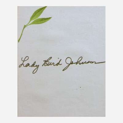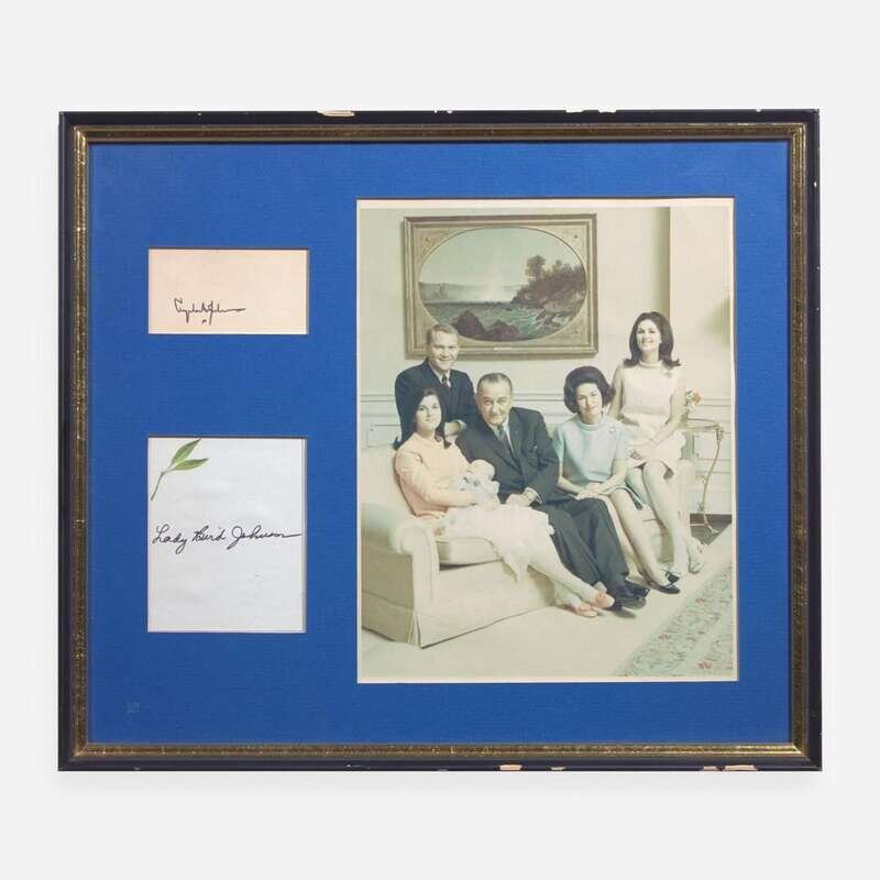 No place, no date. Signed card; 1 3/4 x 3 1/4 in. (44 x 83 mm). In mat with card signed by First Lady, Lady Bird Johnson, and a contemporary Presidential family portrait, and in frame, 13 1/4 x 15 1/4 in. (336 x 387 mm).