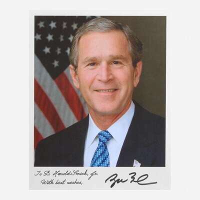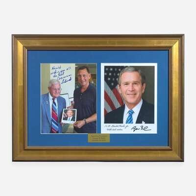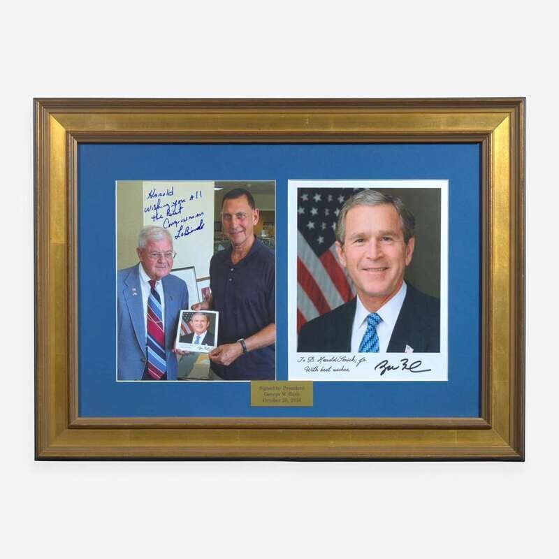 No place, October 20, 2016. Color photograph, signed by Bush; 10 x 7.75 in. (254 x 197 mm); manuscript dedication at bottom left. In mat with another photograph, signed by New Jersey Congressman Frank LoBiando, and in frame, 17 3/4 x 24 in. (451 x 610 mm).