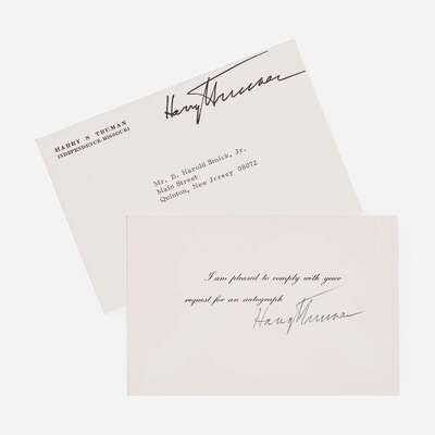 No place, no date. Card signed by Harry Truman complying with a request for an autograph; 4 x 6 in. (102 x 152 mm); with its original mailing envelope.