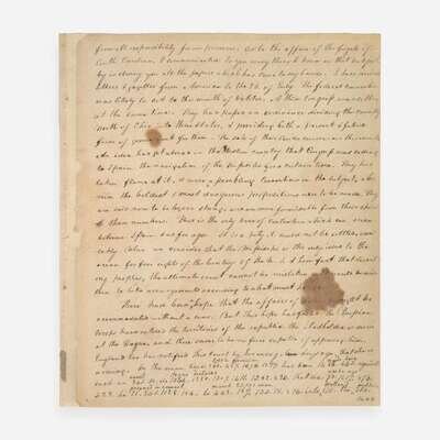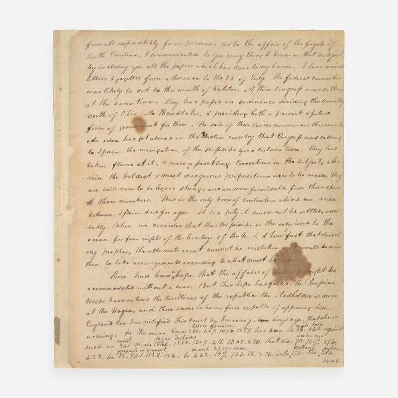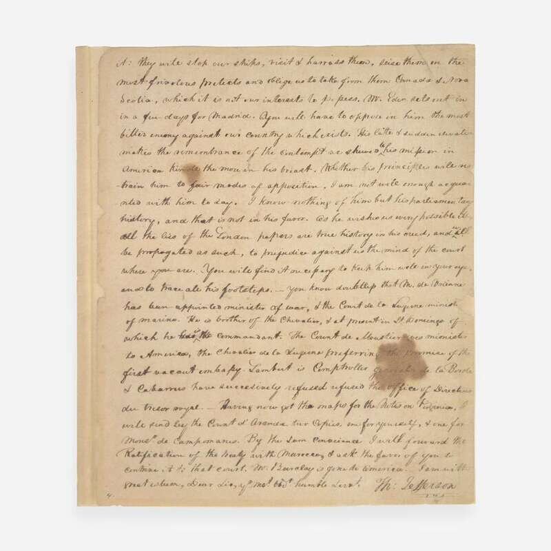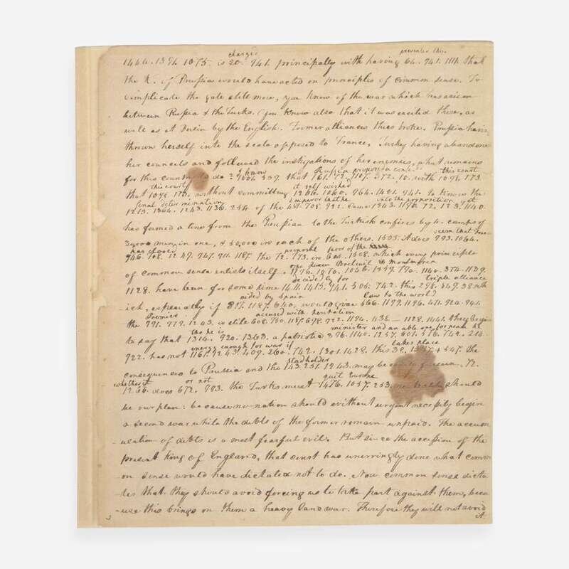 The original letter is the first known use of a code cipher between Thomas Jefferson and William Carmichael. First penned one week after the conclusion of the Consituttional Convention, Thomas Jefferson discusses the recently enacted Northwest Ordinance, relations with the Empire of Spain, the accumulation of national debts, American prisoners in Algiers, his book Notes on Virginia, preludes to war in Holland and Russia, a new treaty with Morrocco, the Turkish question in Europe, and more. Jefferson's original letter has not been traced, and this is one of only two known copies of it. Founders Online identifies a press copy made by Jefferson, located in the Library of Congress (with the encoded text deciphered on another sheet), and this copy, made ca. 1850s, describing it as "in H. A. Washington’s hand, with coded passages decoded interlineally, but with several omissions." Henry Augustine Washington (1820-58) was a professor of history at the College of William and Mary in Virginia, and a descendant of George Washington. In the early 1850s he was hired by the State Department to sort and index Jefferson's papers, and in 1854, under his editorship, the government began publication of the nine-volume, The Writings of Thomas Jefferson: Being His Autobiography, Correspondence, Reports, Messages, Addresses, and Other Writings, Official and Private, compiled from those original papers. This copy was presumably made from Jefferson's press copy while in Washington's care.