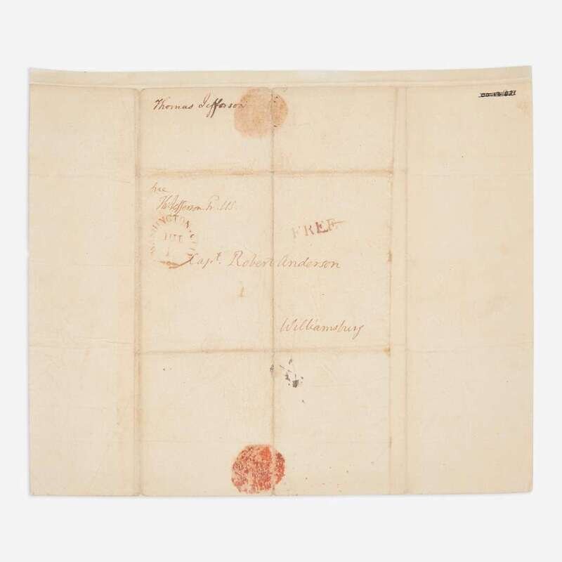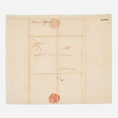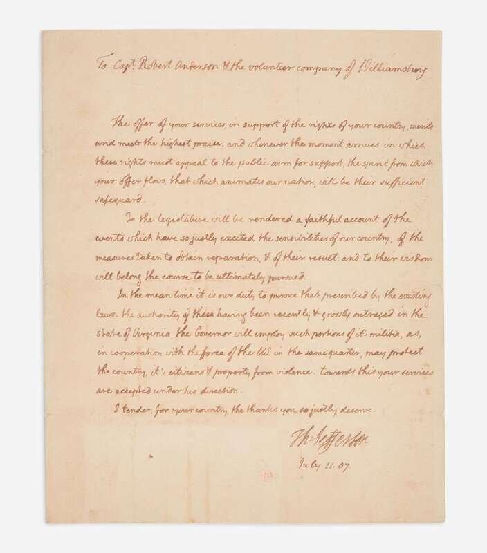 (Washington, D.C.), July 11, (18)07. One sheet folded to make four pages, 9 3/4 x 8 in. (279 x 203 mm). An unrecorded autograph letter, signed by Thomas Jefferson as President of the United States, to Captain Robert Anderson and the Volunteer Company of Williamsburg, responding to their offer of their services following the Chesapeake-Leopard Affair the previous June. With the original address leaf present, addressed and free franked by Jefferson, and docketed in another hand to same; remnants of original wax seal present; each sheet silked; creasing from original and contemporary folds. This letter is not printed in The Papers of Thomas Jefferson (Princeton University Press), nor on Founders Online.
