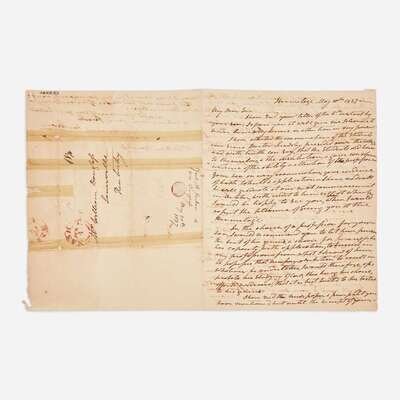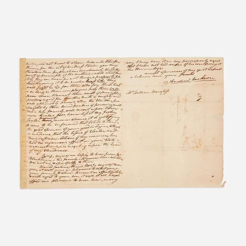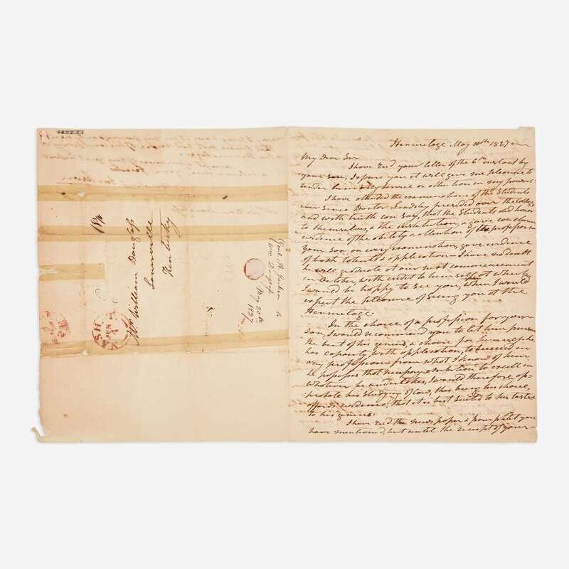 Hermitage, May 30, 1827. One sheet folded to make four pages, 9 7/8 x 7 7/8 in. (251 x 200 mm). Lengthy autograph letter, signed by Andrew Jackson, to William Douglass, a friend and political supporter from Louisville, Kentucky, advising Douglass on a career path for his son, and lamenting against journalists and pamphleteers who slander his and his family's name; addressed on integral leaf by Jackson, with "Gen. Jackson", seemingly in another hand, scratched out; docketed on integral leaf, postmark stamp and original red wax seal on same. Creasing from contemporary folds; sello tape repairs along fore-edge of second page, just touching a few letters, and along folds on fourth page; remnants from old mount in fore-edge corners of fourth page. This letter is printed in Volume VI of The Papers of Andrew Jackson: 1825-1828 (p. 327-328, University of Tennessee Press, 1980).