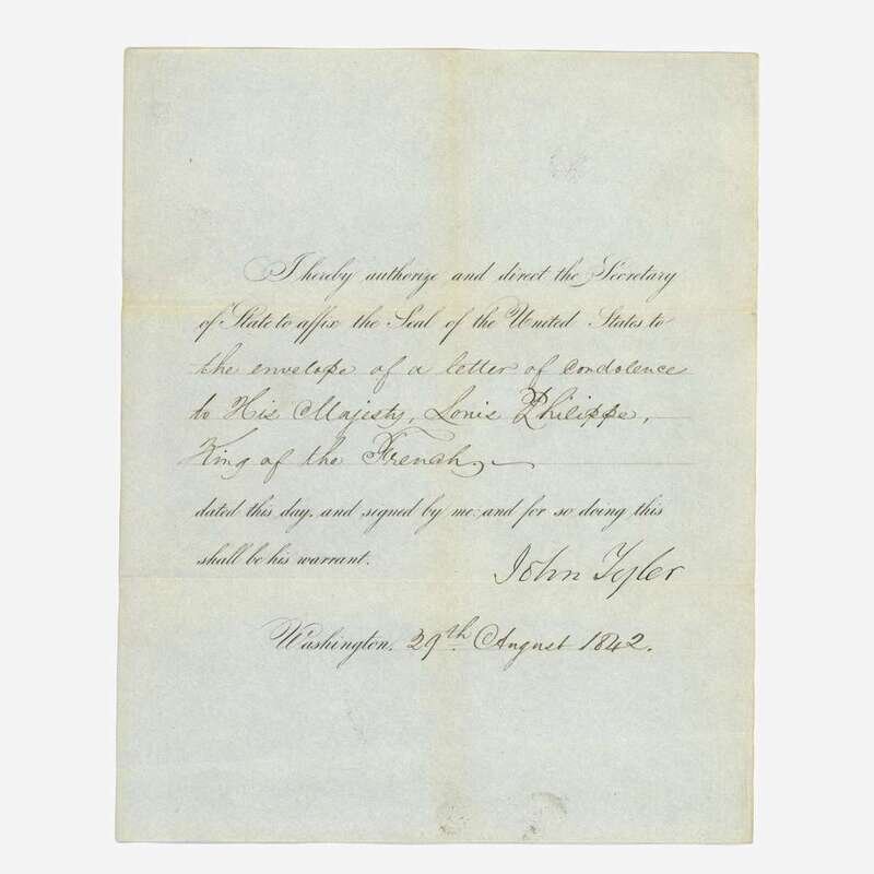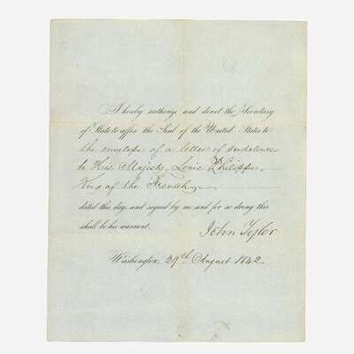 Washington, (D.C.), August 29, 1842. One sheet folded to make four pages, 10 x 8 1/4 in. (254 x 209 mm). Partially-printed presidential order, signed by Tyler, directing "the Secretary of State," Daniel Webster, "to affix the Seal of the United States to the envelope of a letter of Condolence to His Majesty, Louis Philippe, King of the French."; docketed on verso; creasing from contemporary folds; bottom horizontal crease just touching Tyler's signature.