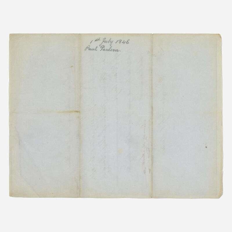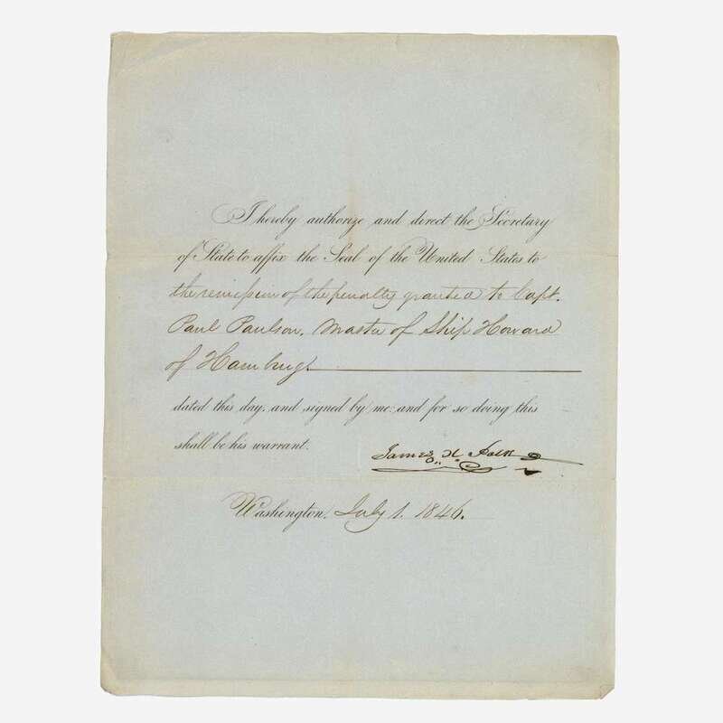Washington, (D.C.), July 1, 1846. One sheet folded to make four pages, 10 x 8 1/4 in. (254 x 209 mm). Partially-printed presidential order, signed by Polk, directing "the Secretary of State," and future president, James Buchanan, "to affix the Seal of the United States to the remission of the penalty granted to Capt. Paul Paulson, Master of Ship Howard of Hamburg."; docketed in pencil on verso; creasing from contemporary folds, scattered edge-wear.
