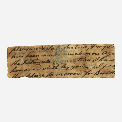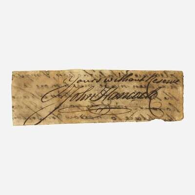 No place, no date. Signature of John Hancock cut from an autograph letter, "Yours without Reserve John Hancock."; 1 1/2 x 6 1/4 in. (38 x 133 mm). Five lines of Hancock's letter can be seen on verso. Small tear at center crease between "John" and "Hancock", repaired with tape on verso.