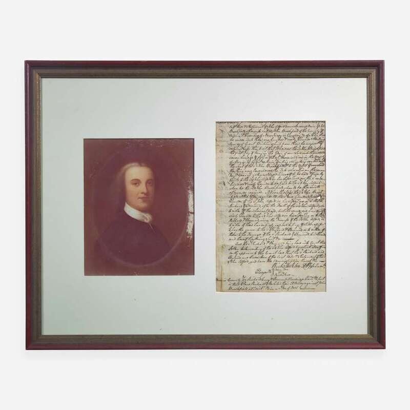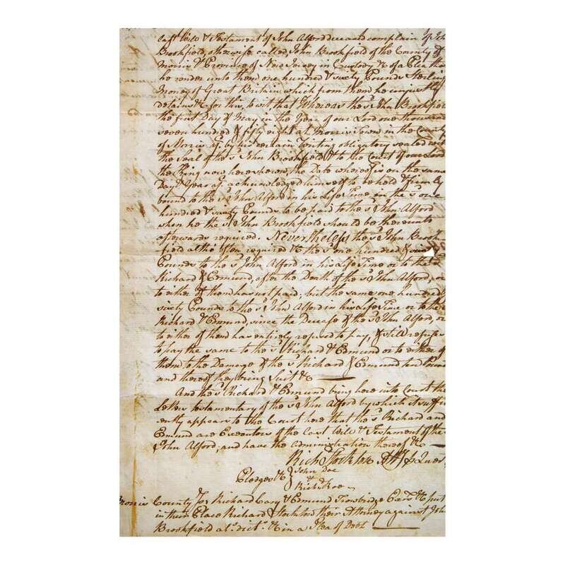 Morris County, New Jersey, after 1761. One sheet, 11 1/8 x 7 1/4 in. (282 x 184 mm). Autograph legal document on two pages, signed twice by Signer of the Declaration of Independence from New Jersey, Richard Stockton, an attorney representing Richard Cary and Edmund Trowbridge, executors of the estate of John Alford, in their lawsuit with John Brookfield, of Morris County, New Jersey, over a debt of "one hundred & sixty Pounds Sterling money of Great Britain which from them he unjustly retains..."; lengthy passage on verso entirely in Stockton's hand concerning the lawsuit's debt obligation, endorsed at bottom of same by Jacob Moor. Trimmed along top edge, shaving some words and letters; creasing from old folds, small separations along same; open tear at center fold in right edge. In mat with portrait of Stockton, and in frame, 18 3/8 x 23 in. (467 x 584 mm).